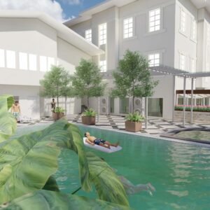 b. Gambar Render Kasar 3D Exterior (belum sejernih final render), dimana klien akan dibuatkan 10-50 view bangunan untuk mempresentasikan tampilan bangunan dan suasana exterior bangunan.